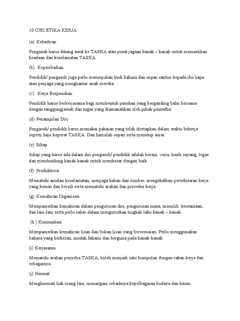 37 Etika Kerja Kementerian Pelajaran Malaysia KPM mendefinisikan Etika Kerja sebagai panduan tingkah laku yang menjadi pegangan setiap warga kementerian di tempat kerja massing-masing. Kod etika ini juga dipunyai oleh profesion perguruan. Etika secara umum dapat dibagi menjadi.
